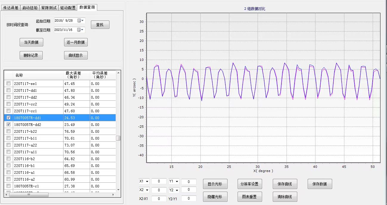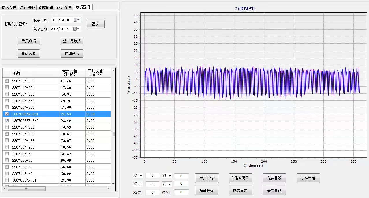 對輸入軸提供任意的旋轉角度,測試輸出軸理論上旋轉角度和實際旋轉角度的差。測試時,同步采集輸入端和輸出端角度變化量,然后根據減速,計算理論上旋轉角度和實際旋轉角度的差角度傳達誤差。